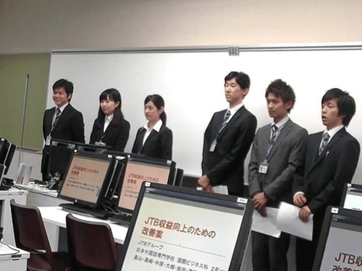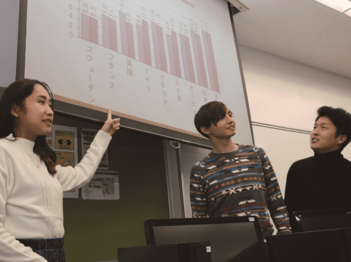 ICTを活用したプレゼンテーション技能、チームで意見を共有し、商品やサービスに新たな価値を生み出すマーケティングを学びます。人前に立ち、自分の意見を論理的に伝える方法を身に付けます。 キャリアビジョンの土台を作るための授業もあります。
